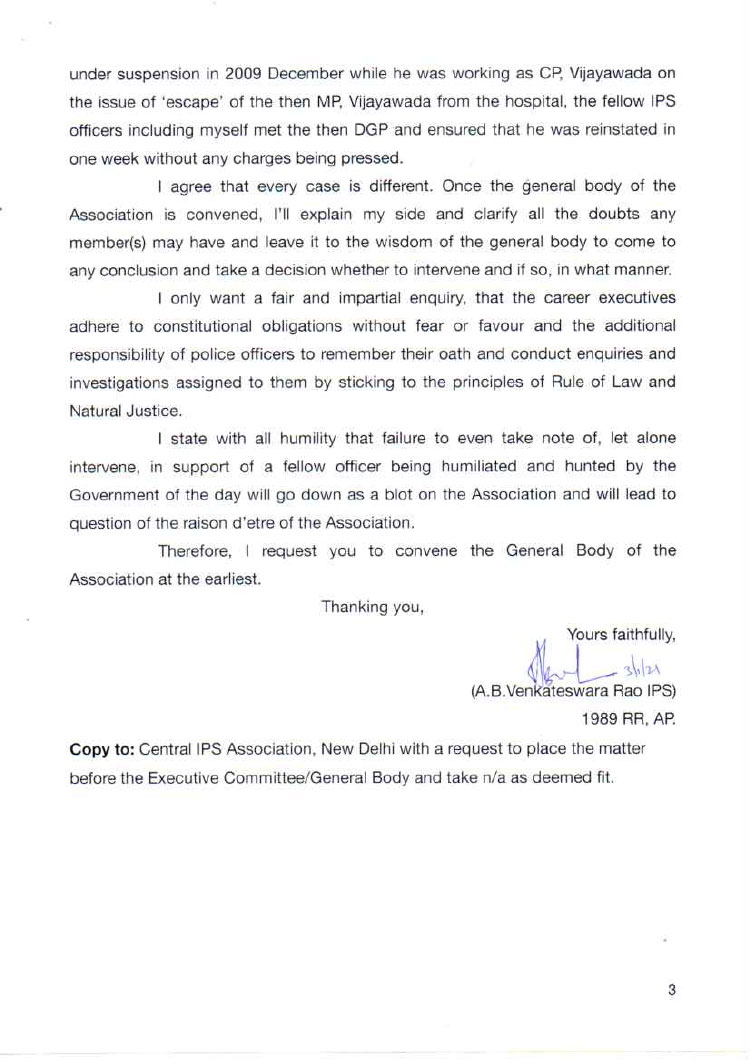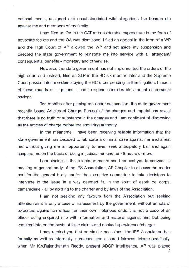 తనకు న్యాయం జరగాలంటే.. ఐపీఎస్ అధికార్ల సంఘం సర్వసభ్య సమావేశాన్ని నిర్వహించి.. ఈ వేధింపుల గురించి చర్చించాలని ఆయన ఆ లేఖలో కోరారు. ఈ లేఖ ప్రతులను- న్యూ ఢిల్లీలోని కేంద్ర ఐపీఎస్ అధికార్ల సంఘానికి కూడా పంపారు. కార్యనిర్వహక కమిటీ లేదా, సర్వసభ్య సమావేశం ఎదుట ఈ లేఖను ఉంచి చర్చించాల్సిందిగా కోరారు.