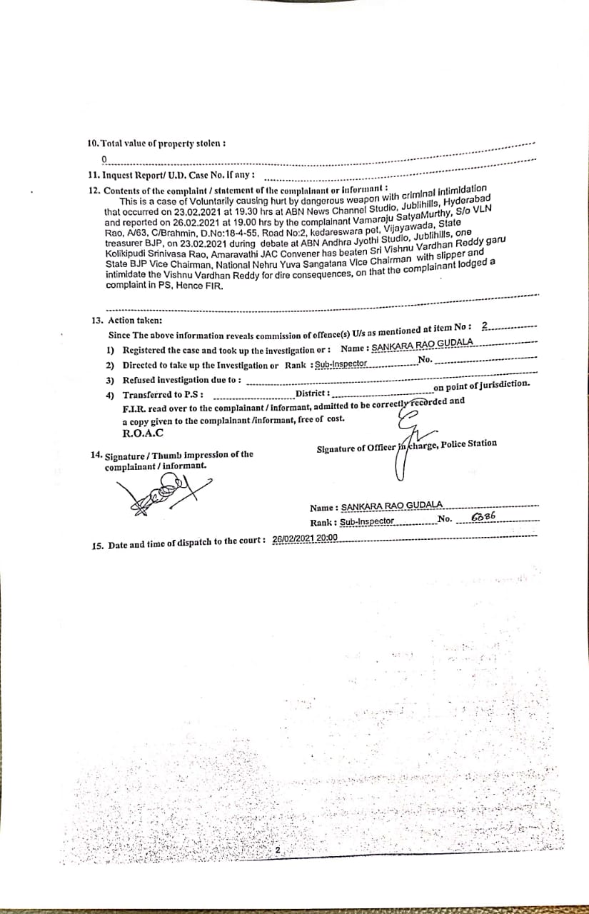‘చెప్పు’ అని చెప్పకుండా… ప్రమాదకరమైన ఆయుధంతో కుట్రపూరితంగా దాడి చేశారని ఫిర్యాదులో పేర్కొన్నారు. దీనిపై పోలీసులు ఐపీసీ 324, 506 సెక్షన్ల కింద కేసు నమోదు చేశారు. సత్యరాజు రాసి ఇచ్చిన ఫిర్యాదులోని సారాంశాన్నే ఎఫ్ఐఆర్లో పొందుపరిచారు. ప్రస్తుతానికి విజయవాడలో కేసు నమోదు చేసినప్పటికీ, దాడి జరిగింది హైదరాబాద్ లో కావడంతో తర్వాత అక్కడికి బదిలీ చేస్తామని ఓ పోలీసు అధికారి చెప్పారు.