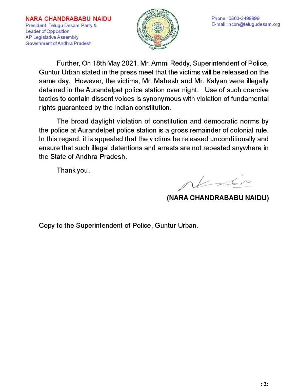 ‘మే 18న మధ్యాహ్నం 12గంటల సమయంలో గుంటూరులోని అరండల్ పేట్ పోలీసులు 41-ఎ నోటీసులతో పాటు ఎలాంటి నోటీసులు లేకుండా అరెస్టు చేశారు.నిబంధనలను ఉల్లంఘించి ఈ అరెస్టులు జరిగాయి.ఇప్పటికే ఇలాంటి కేసులపై సుప్రీంకోర్టు పలు ఆదేశాలు జారీ చేసింది.అర్నిష్ కుమార్ VS బీహార్-2014 కేసుతో పాటు సుప్రీంకోర్టు కూడా భావప్రకటన స్వేచ్ఛకు సంబంధించి ఆదేశాలు జారీ చేసింది.ఆ ఆదేశాలను కూడా పట్టించుకోకుండా అరెస్టులు చేశారు. పోలీసులు అరెస్టు చేసిన ఎం.మహేష్, కల్యాణ్లను అరెస్టు చేయడంతో పాటు వారి ముఖాలకు మాస్క్లు వేసి మీడియా ముందు ప్రవేశపెట్టి మరీ ఎస్పీ అమ్మిరెడ్డి ప్రెస్ మీట్ నిర్వహించారు.అధికార YCP పార్టీకి వ్యతిరేకంగా పోస్టులు పెట్టడాన్ని కారణంగా చూపి అరెస్టు చేశారు.కాగా అరెస్టు చేసిన మహేష్,కల్యాణ్లను అదే రోజు విడుదల చేస్తామని ప్రెస్ మీట్లో ఎస్పీ చెప్పినా,మే 18న రాత్రిపూట కూడా పోలీస్ స్టేషన్లోనే నిర్భందించి ప్రాథమిక హక్కులకు భంగం కలిగించారు.రాజ్యాంగం ప్రసాధించిన ప్రాథమిక హక్కులకు భంగం కలిగించడంతో పాటు స్వేచ్ఛను హరించే విధంగా వ్యవహరించారు.వాళ్లని వెంటనే విడుదల చేయాలి.రాష్ట్రంలో మరోసారి ఇలాంటి ఘటనలు జరగకుండా చర్యలు తీసుకోవాలి’అని చంద్రబాబు పేర్కొన్నారు.