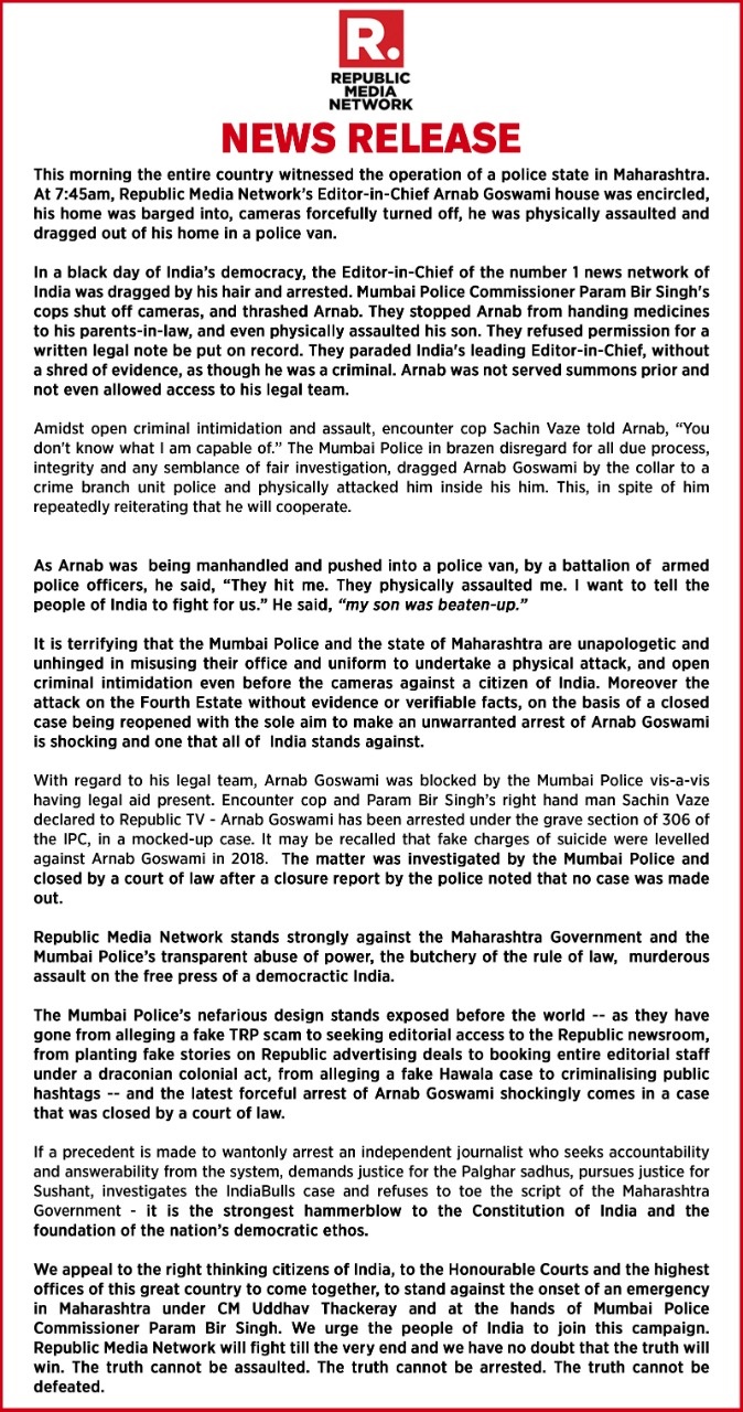 The Alibaug Police on Wednesday morning arrested Republic TV Editor Arnab Goswami from his Mumbai residence, for having allegedly abetted the death of an interior designer Anvay Naik and his mother Kumud Naik in 2018. The move comes in the wake of Maharashtra Home Minister Anil Deshmukh announcing a fresh CID probe. Reacting on the issue, Republic TV quashed all the allegations and made it clear that a malicious campaign is being launched against it, adding that all non-payments which were due to Concorde Designs, have been paid.