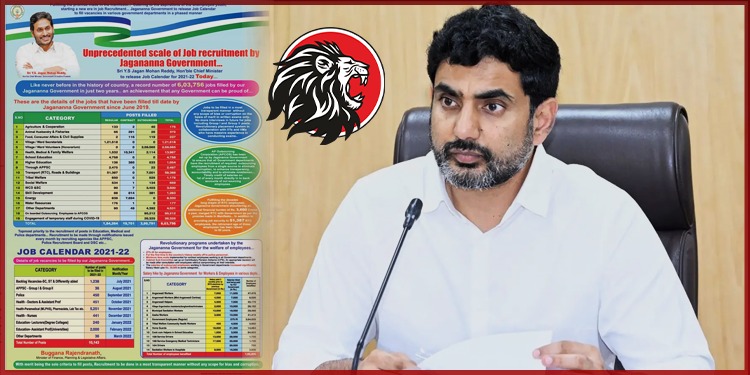 ఉద్యోగాలు ఏమీ ఇవ్వక పోయినా ఇచ్చినట్టు బిల్డప్ ఇస్తూ కోట్ల రూపాయలు మీడియాకి ప్రకటనలు ఇచ్చుకున్నారని, ఇందులోనూ అన్నీ క్విడ్ప్రోకో దొంగ లెక్కలేనా అని జగన్రెడ్డిని నారా లోకేష్ నిలదీశారు. 2 లక్షల 30 వేల ప్రభుత్వ ఉద్యోగాలు అని యాడ్ ఇచ్చి, అందులో వందల్లో సర్కారీ కొలువులు, మిగిలినవన్నీ వైసీపీ కార్యకర్తలకిచ్చిన ఔట్ సోర్సింగ్, కాంట్రాక్ట్ నౌకరీలను కలిపేశారన్నారు. వలంటీర్లది ఉద్యోగం కాదు సేవ అని సెలవిచ్చిన సీఎం, మరి ఇప్పుడు జాబు క్యాలెండర్లో 2 లక్షల 59 వేలకు పైగా ఉద్యోగాలు కల్పించామని ఎలా పేర్కొంటారని నిలదీశారు. అప్పటి చీఫ్ సెక్రటరీ నీలం సహానీ గ్రూప్-1&2 పోస్టులు 907, పోలీస్ శాఖలో 7740 ఖాళీలున్నాయని ప్రకటిస్తే, డూబురెడ్డి కేలండర్లో గ్రూప్-1&2 పోస్టులు 36, పోలీస్శాఖలో 450 పోస్టులున్నాయన్నారని, చీఫ్ సెక్రటరీ ప్రకటనకి చీఫ్ మినిస్టర్ ప్రకటనలకు మధ్య వేల ఉద్యోగాలు ఎవరు ఎత్తుకెళ్లారని ప్రశ్నించారు. సీఎం ప్రకటించిన గ్రూప్-1&2 36 పోస్టులూ ఆల్రెడీ ఏ2, ఏ1 బాబాయ్, సలహాలరెడ్డి అమ్మేశారని తాడేపల్లి కాంపౌండ్ నుంచే గుసగుసలు వినిపిస్తున్నాయని ఆరోపించారు. ఆల్రెడీ ఆర్టీసీలో పనిచేస్తోన్న 54 వేల మంది ఉద్యోగుల్ని ప్రభుత్వంలో విలీనం చేయడం ద్వారా కొత్తగా ఉద్యోగాలు కల్పించినట్టు ప్రకటించుకోవడం వైసీపీ కపట ప్రకటనలకు అద్దం పడుతోందన్నారు. లక్షల ఉద్యోగాలు కల్పించామని, ఇస్తున్నామని ప్రకటించిన ప్రభుత్వం వాస్తవంగా 10 వేల జాబ్ నోటిఫికేషన్లు మాత్రమే ఇచ్చిందన్నారు. వార్డు/గ్రామ సచివాలయంలో 1లక్ష 20 వేల పైబడి ఉద్యోగాలు ఇచ్చామని ప్రకటించుకున్న ప్రభుత్వం, దీని వల్ల 30 వేలమందికి పైగా మీసేవపై ఆధారపడి బతుకుతున్ననిరుద్యోగులను రోడ్డున పడేయలేదా అని ప్రశ్నించారు.