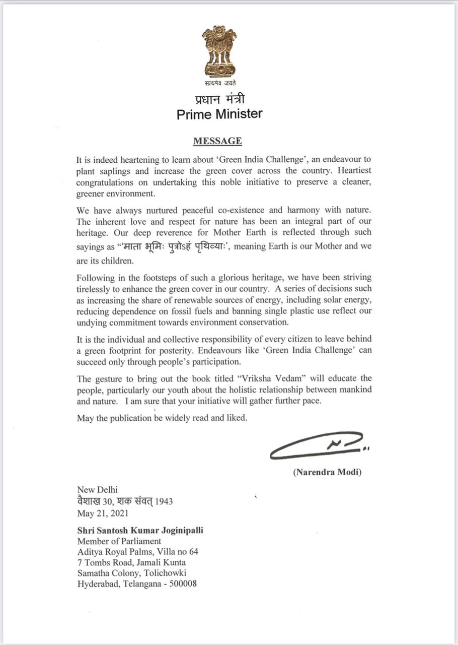 కాగా గ్రీన్ ఇండియా ఛాలెంజ్ను అభినందిస్తూ లేఖ రాసిన ప్రధాని మోదీకి ఎంపీ జోగినపల్లి సంతోష్కుమార్ కృతజ్ఞతలు తెలిపారు.ప్రధాని మోదీ ఇచ్చిన ప్రోత్సాహంతో గ్రీన్ ఇండియా ఛాలెంజ్ కార్యక్రమాన్నిమరింత ముందుకు తీసుకెళ్తానని పేర్కొన్నారు.పచ్చదనం పరిశుభ్రత,మొక్కలు నాటడం,చెట్ల పరిరక్షణ లక్ష్యంగా గ్రీన్ ఇండియా ఛాలెంజ్ని ప్రారంభించిన ఎంపీ జోగినపల్లి సంతోష్కుమార్ విడతల వారీగా ఈ కార్యక్రమాన్ని విస్తరించారు.మొత్తం నాలుగు విడతల్లో ఈ కార్యక్రమాన్ని నిర్విరామంగా పూర్తి చేశారు.టాలీవుడ్ సెలబ్రిటీలు,రాజకీయ నాయకులు,ప్రముఖులను భాగస్వాములను చేయడం ద్వారా పలువురిలో స్ఫూర్తిని రగిలించారు.సామాన్య ప్రజనీకంతో పాటు ఎంతో మంది సెలబ్రిటీలకు ఈ ఛాలెంజ్ విసరడం ద్వారా ప్రముఖులను భాగస్వాములుగా చేశారు.పార్టీలకు అతీతంగా కూడా కొందరు రాజకీయ నాయకులు ఈ ఛాలెంజ్కు స్పందించిన సందర్భాలూ ఉన్నాయి.