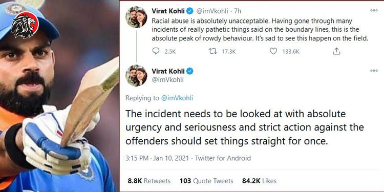 ఆసీస్ అభిమానుల జాత్యహంకార వ్యాఖ్యలపై టీమిండియా కెప్టెన్ విరాట్ కోహ్లీ సీరియస్ అయ్యాడు. “జాత్యహంకార వ్యాఖ్యలు ఏమాత్రం సహించరానివి. మైదానంలో ఇప్పటికే ఇలాంటి ఎన్నో ఘటనలు జరిగాయి. మళ్లీ గ్రౌండ్లో వాటిని చూడడం విచారకరం. ఇది అసలుసిసలైన రౌడీ ప్రవర్తనకు నిదర్శనంగా కనిపిస్తోంది” అని కోహ్లీ ట్వీట్ చేశాడు. ఈ ఘటనపై విచారణ జరపాలని, మళ్లీ ఇలాంటివి జరగకుండా బాధ్యులపై కఠినమైన చర్యలు తీసుకోవాలని మరో ట్వీట్లో పేర్కొన్నాడు.