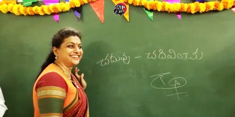 పై ఫొటో చూశారా?. అందులో ఉన్న సెలబ్రిటీ పేరు చెప్పక్కర్లేదు కదా. ముందు సినిమాల్లో సత్తా చాటి.. ఆ తర్వాత రాజకీయాల్లోకి వచ్చి ఆదిలో తీవ్ర ఒడిదుడుకులు ఎదుర్కొన్నా.. ఆ తర్వాత పొలిటీషియన్ గా, వైసీపీ ఎమ్మెల్యేగా సత్తా చాటుతున్న చిత్తూరు జిల్లా నగరి ఎమ్మెల్యే ఆర్కే రోజా ఇలా బడిలో బోర్డుపై అక్షరాలు రాస్తున్నారేమిటా? అని ఆశ్చర్యపోతున్నారా? అంత ఆశ్చర్యపోవాల్సిన పనేమీ లేదు. ఎందుకంటే.. ఒక్క రాజకీయ రంగంలో అదృష్టం కలిసి వస్తేనే వింతలు విడ్డూరాలకు దిగుతున్న మన నేతాశ్రీలను చూస్తున్నాం కదా. అలాంటిది అటు తళుకుబెళుకుల సినిమా రంగంతో ఇటు రాజకీయ రంగంలోనూ సత్తా చాటిన రోజా ఈ మాత్రం తరగతి గదిలో కనిపిస్తే ఆశ్చర్యపోవాల్సింది ఏముంది?